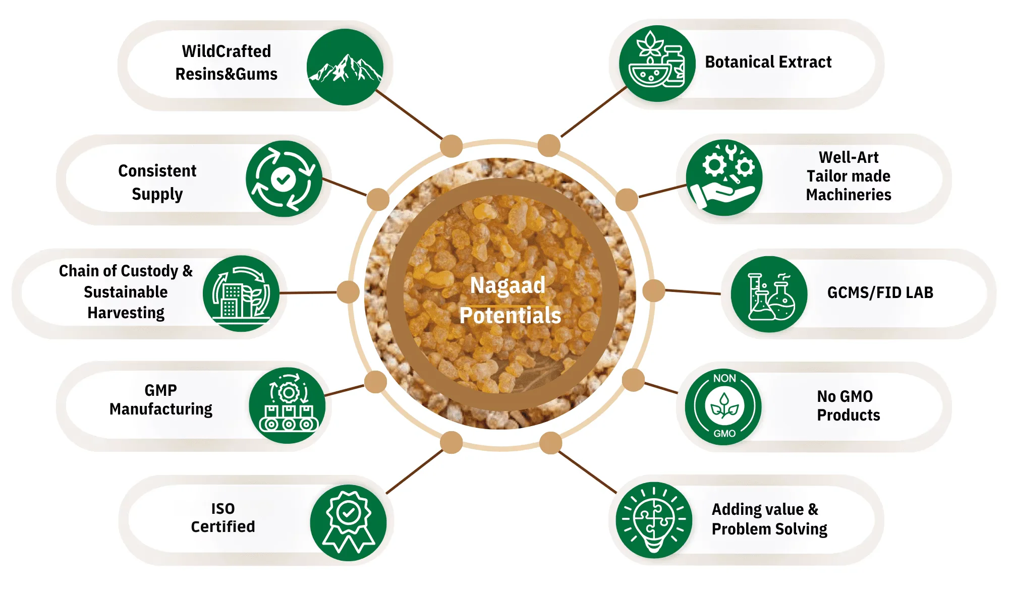 Nagaad is a globally recognized leader in the supply of industrial semi-raw materials, as well as a renowned brand in Beauty, Wellness, and Healthcare, with a legacy spanning over 80 years. As an industry pioneer, we seamlessly integrate traditional botanical remedies with modern scientific advancements to develop premium-quality products centered around Olibanum Frankincense and Commiphora Myrrh—our core active ingredients.